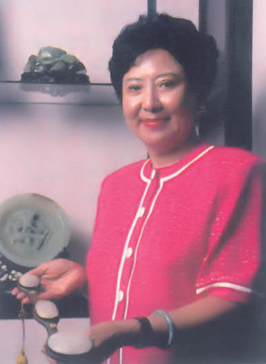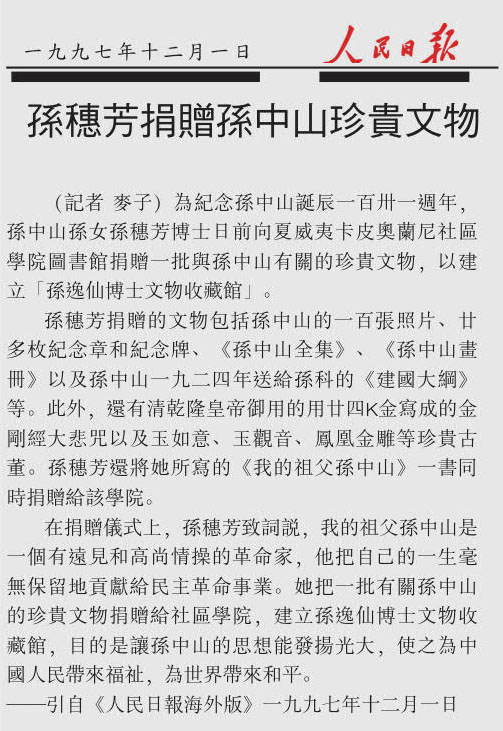 Lily Sui-fong Sun, granddaughter of the Founding Father of the Republic of China Sun Yat-sen, displays a jade piece from the collection of art, books and historical items she donated to the Kapi’olani Community College library. The library’s growing collection of Asian-language materials is named in honor of Sun Yat-sen, who studied in Hawai’i.