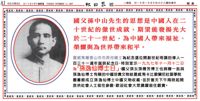 一九九七年十一月十一日,國父一百卅一週年誕辰紀念日,《世界日報》刊登的要聞。