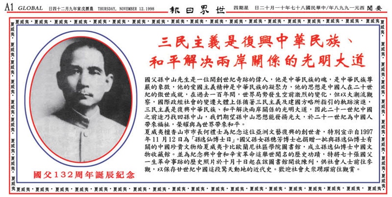 一九九八年十一月十二日,國父一百卅二週年誕辰紀念日,《世界日報》刊登的要聞。