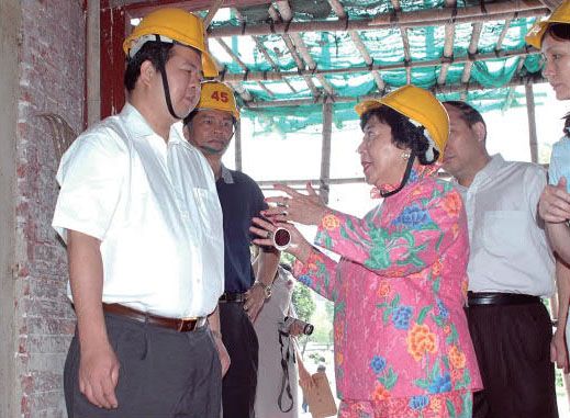零零五年五月廿六日,孫穗芳博士在惠州市政協副主席廖錦堂等的陪同下,到中山公園察看中山紀念堂的修復情況(朱金贊攝)。