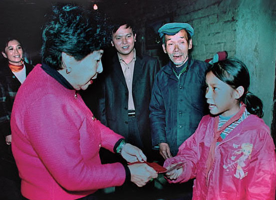 二零零四年,孫穗芳博士親手將助學款交給盧黎燕同學,並鼓勵其認真學習(朱金贊攝)。