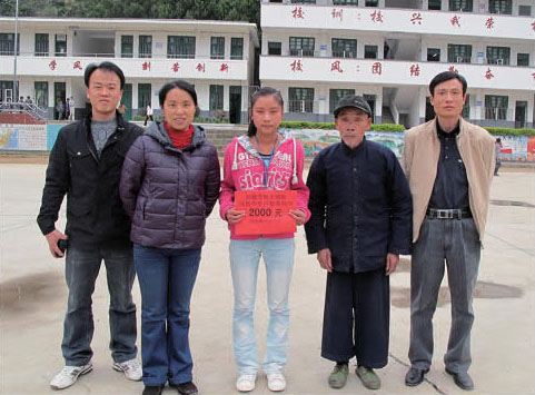 二零一零年十一月卅日,縣委統戰部的領導把孫中山的孫女孫穗芳女士寄來的二千元助學款送到了今已十五歲的盧黎燕同學手中(廣西陽朔縣縣委統戰部提供)。