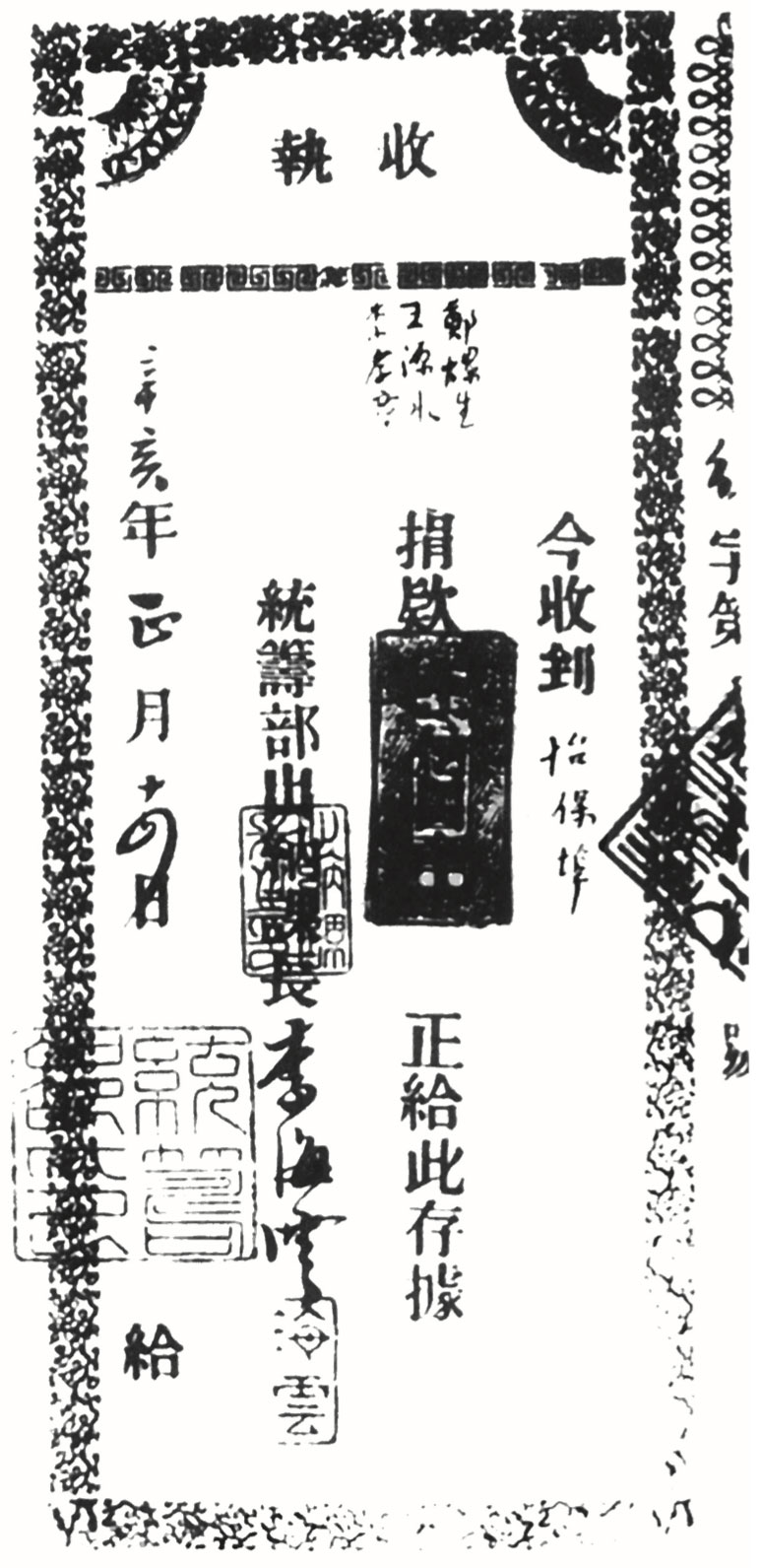 A receipt issued by Dr. Sun upon receiving the donations from overseas Chinese, 1910.