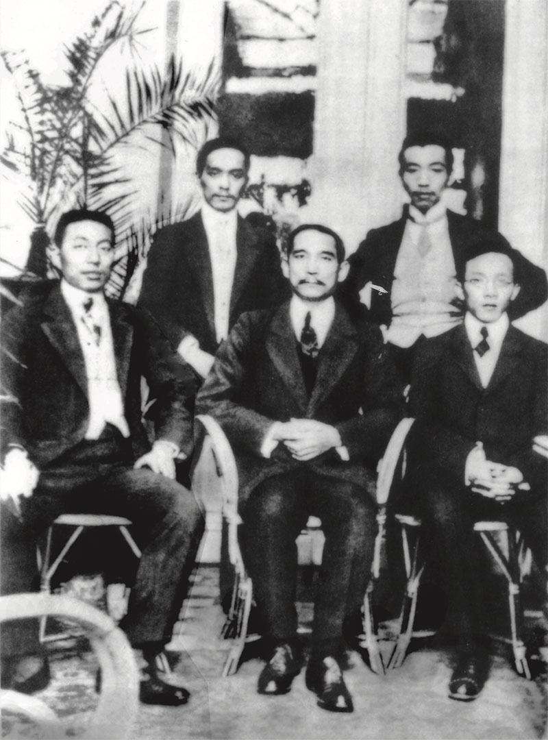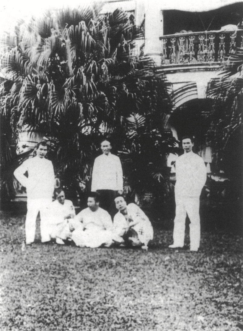 Dr. Sun in Wan Qing Garden in Singapore with comrades who staged the Huanggang Uprising in 1907: (front row, from left) Zhang Yong-fu, Kayano Nagatomo, Lin Wen; (back row, from left) Dr. Sun, Chen Yong-bo and Tang Shou-shan.