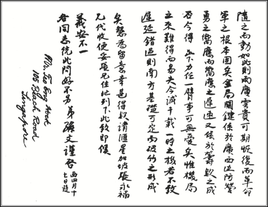 The letter from Dr. Sun to Deng Ze-ru regarding the fund-raising for the 1907 uprisings.