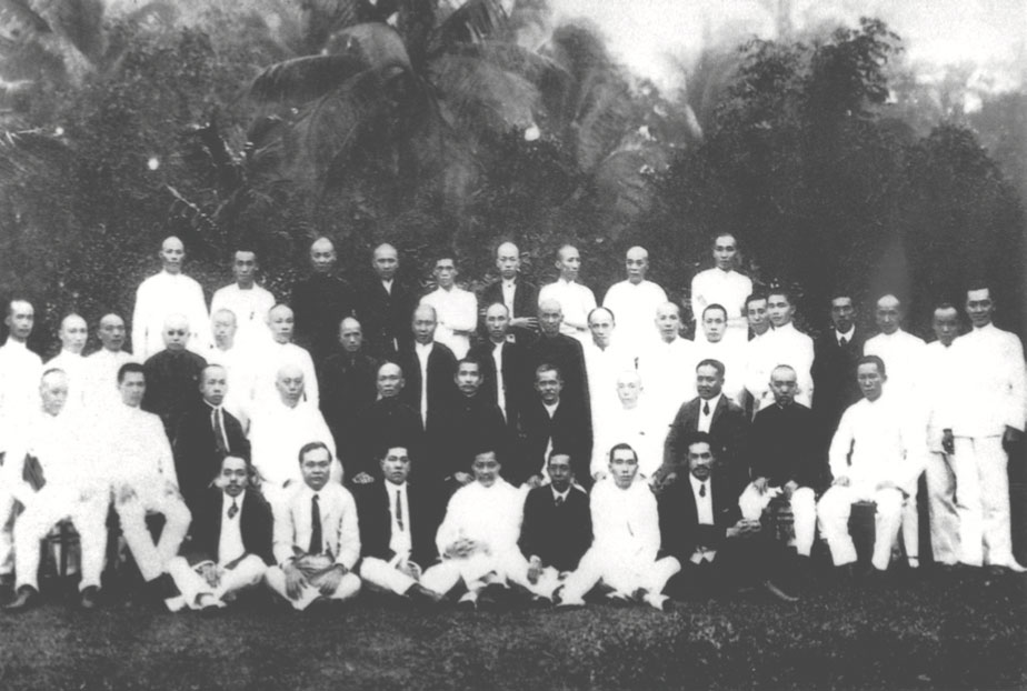 Dr. Sun with members of the Singapore Branch of Tong Meng Hui: (front row, from left) Lin Gan-ting, Zhang Yong-fu, Chen Chu-nan, Dr. Sun, You Lie, Liu Jin-sheng, Lin Yi-shun; (back row from left) Wu Wu-sou, Zhang Hua-dan, Zhang Ji, Chen Ru-he, Deng Z