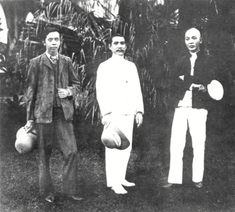 Dr. Sun with Chen Chu-nan (right) and Zhang Yong-fu (left), the president and vice-president of the Singapore Tong Meng Hui Branch, April 1906.