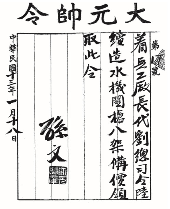 Dr. Sun Yat-sen’s handwritten order to manufacture eight machine guns. The order was not executed due to the false charge of corruption placed on the head of the Shi-jing Arsenal.