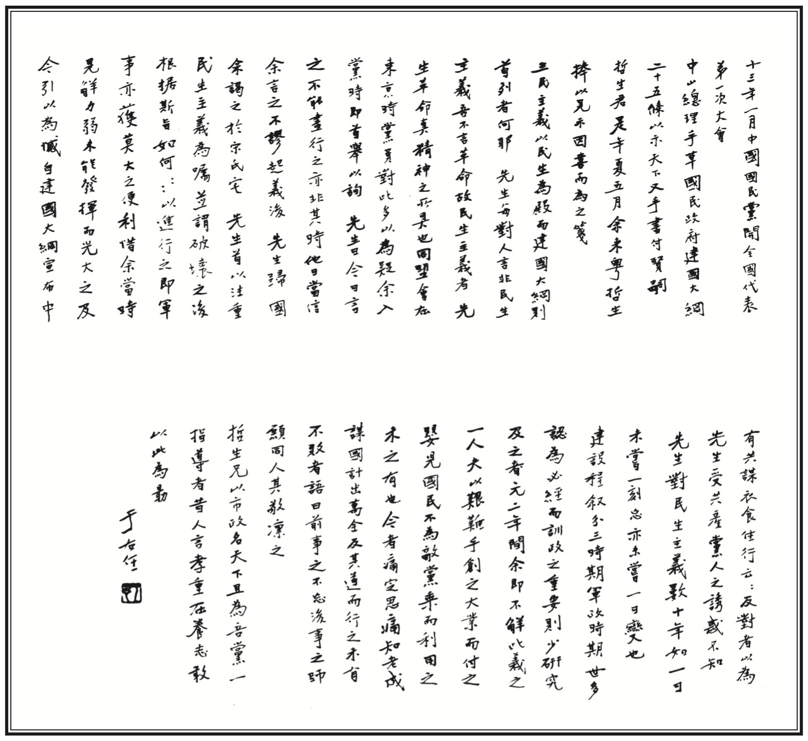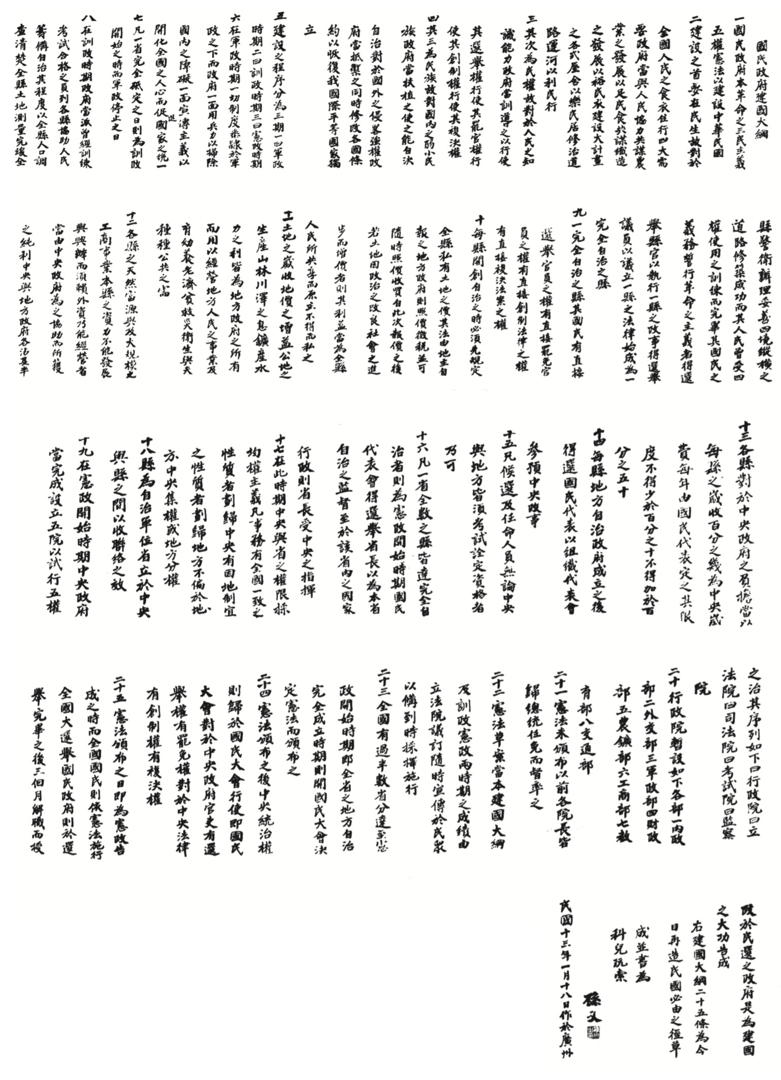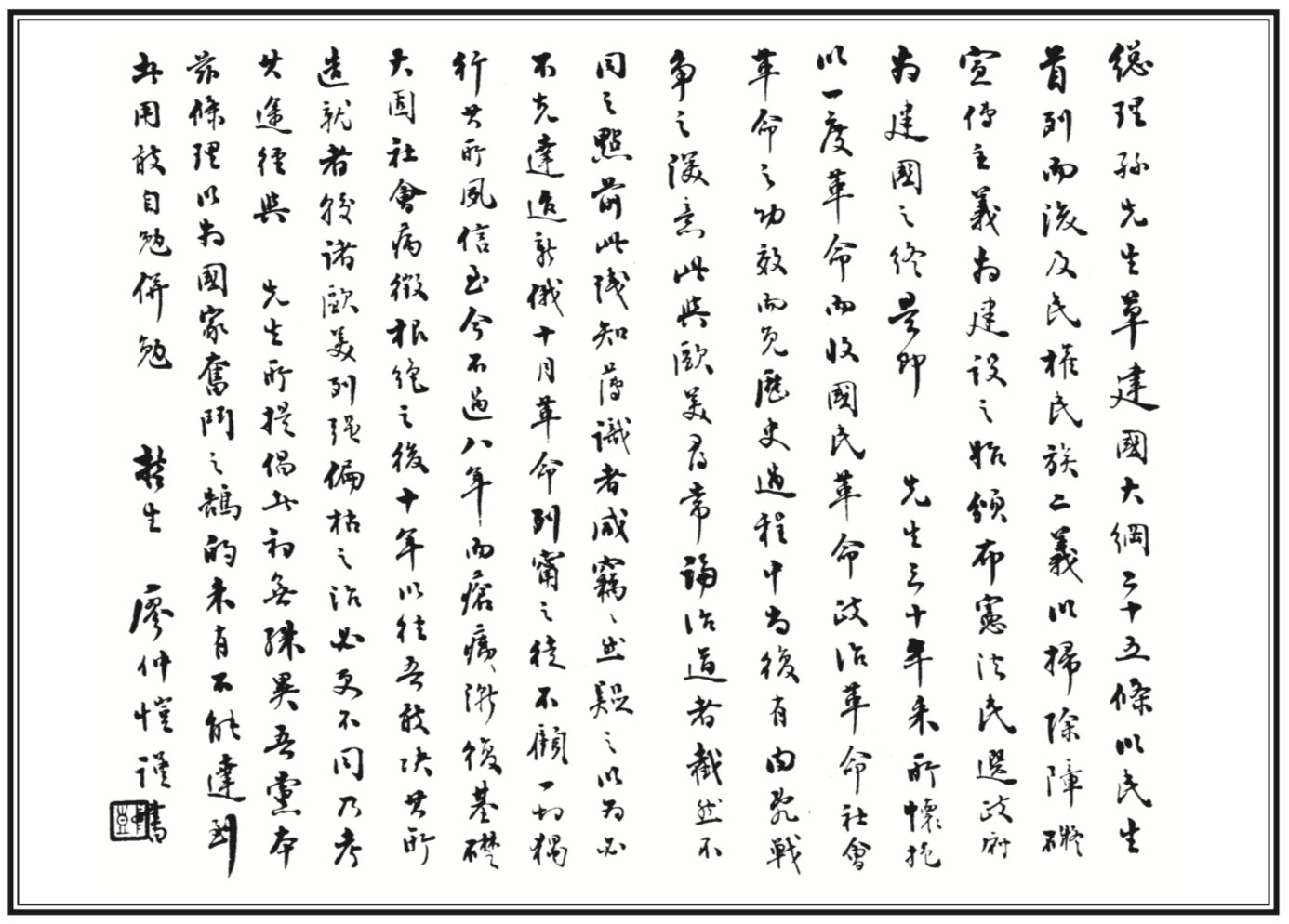 07. 由國父於一九二四年所起草關於建設中國的計劃——《國民政府建國大綱》,又 稱《建國大綱》,全文共廿五條,一千三百餘字,陳述了國父的建國理念和思 想。同年一月廿三日,國民黨第一次全國代表大會審議通過。四月十二日又經國 父親筆謄寫,並對原件稍加修改後正式公布。圖為國父贈其子之《建國大綱》手 書。