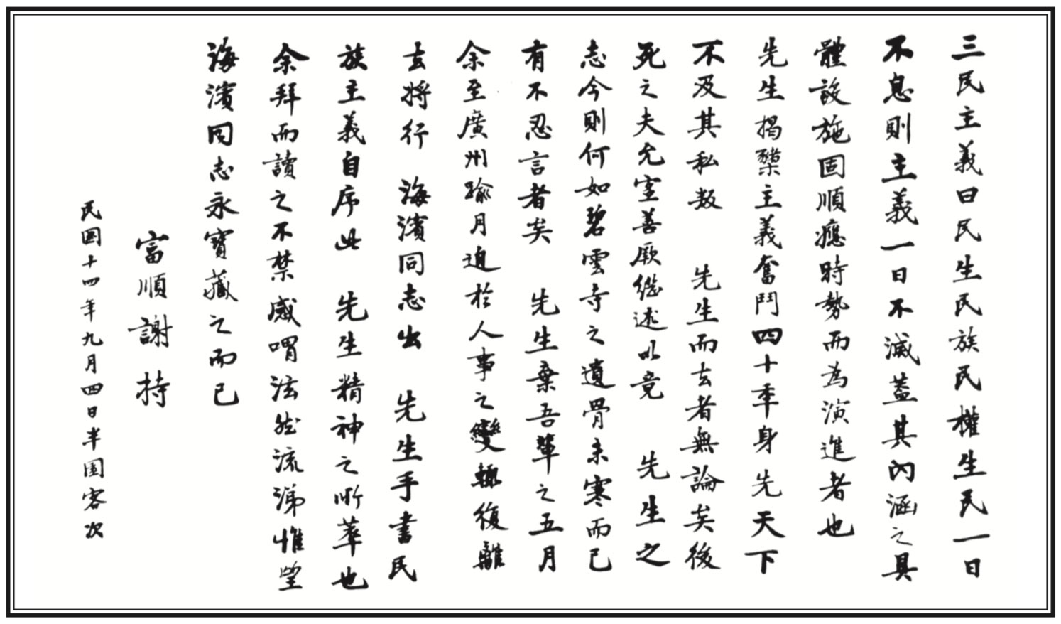 The postscript to The Three Principles of the People by Xie Chi, Sep. 4, 1925.