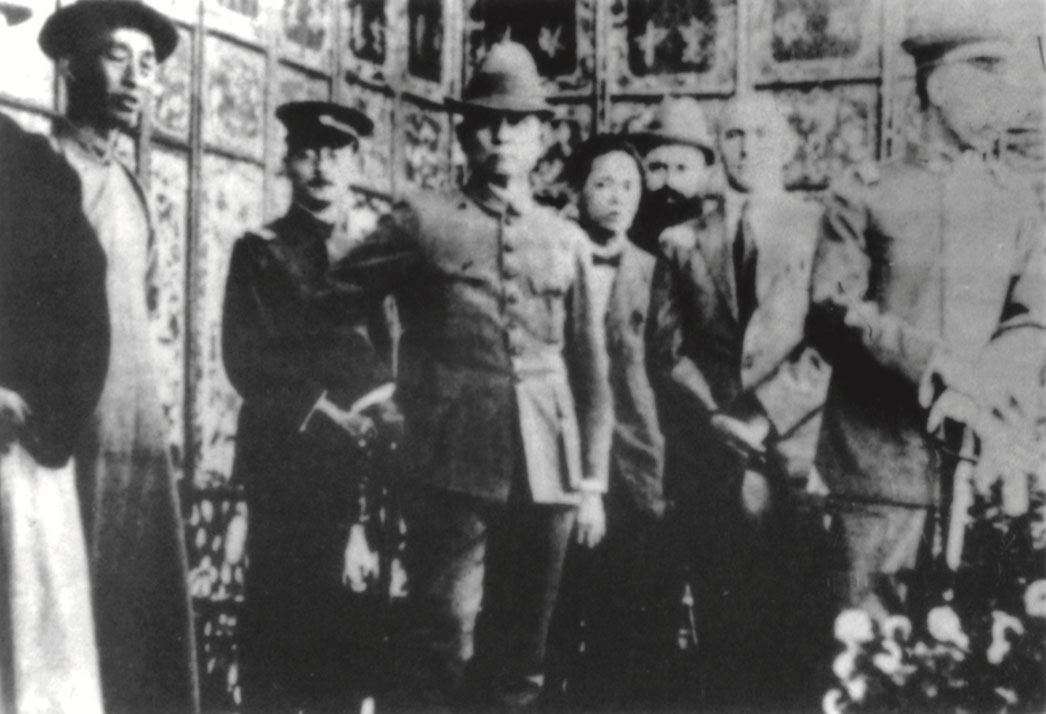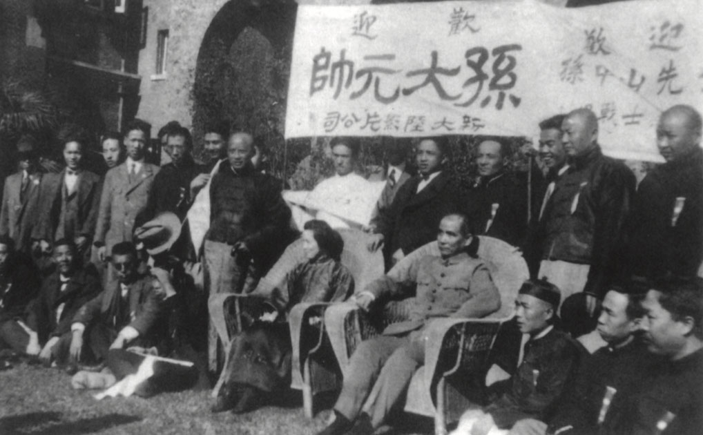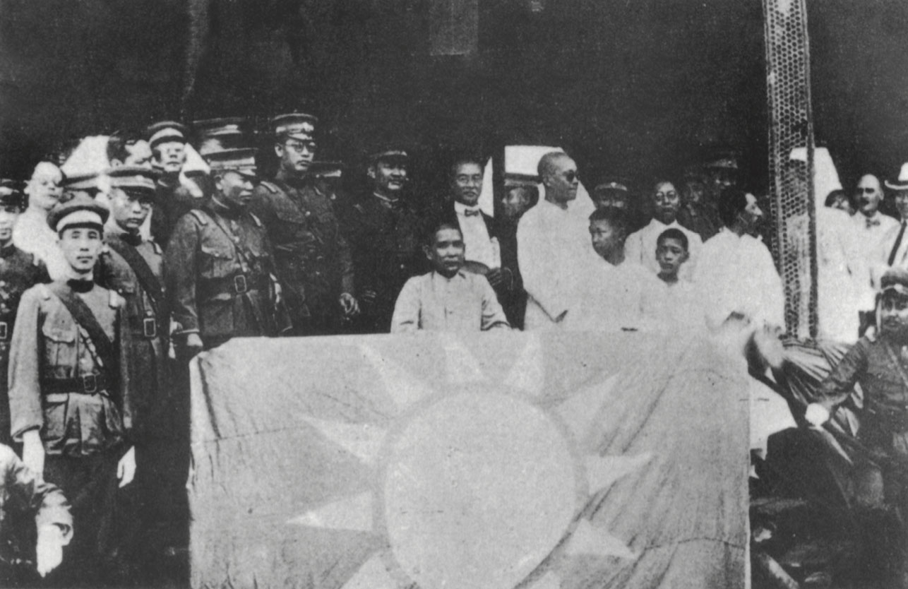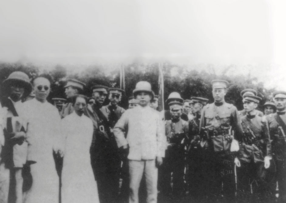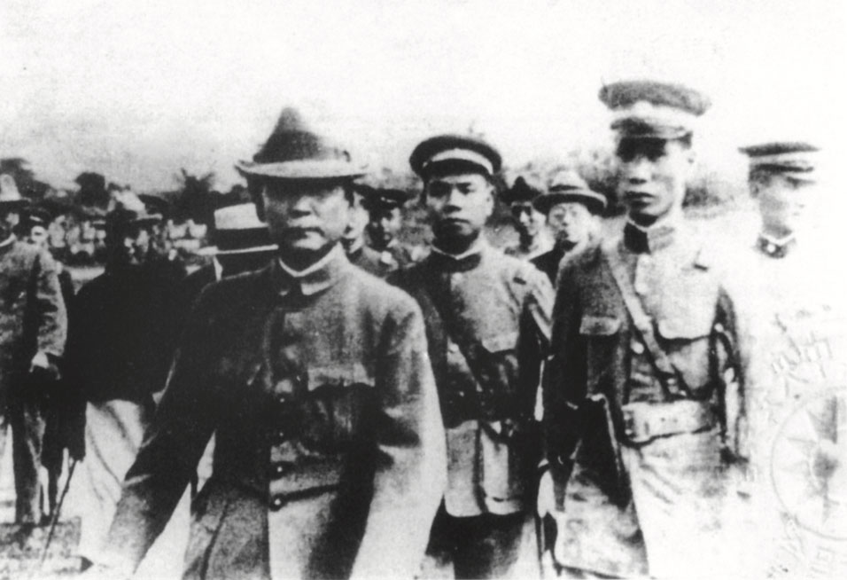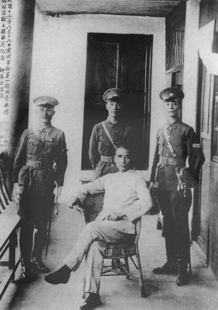 Dr. Sun with Chiang Kai-shek, president of the Huangpu Military Academy (standing, center), He Ying-qin (left) and Wang Bo-ling after the academy’s opening ceremony, Jun. 16, 1924.