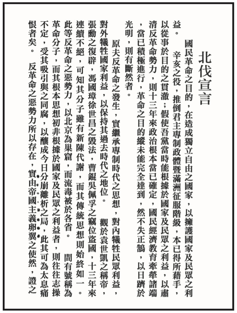 15. 一九二四年九月十三日,國父移大本營於廣東韶關,誓師北 伐。圖為九月十八日發布的〈北伐宣言〉。