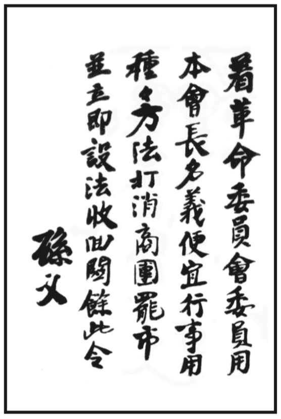 The order given by Dr. Sun to the Revo- lution Committee to suppress the strike initiated by the Guangzhou Merchant Group and to retrieve custom sover- eignty, Oct. 10, 1924.