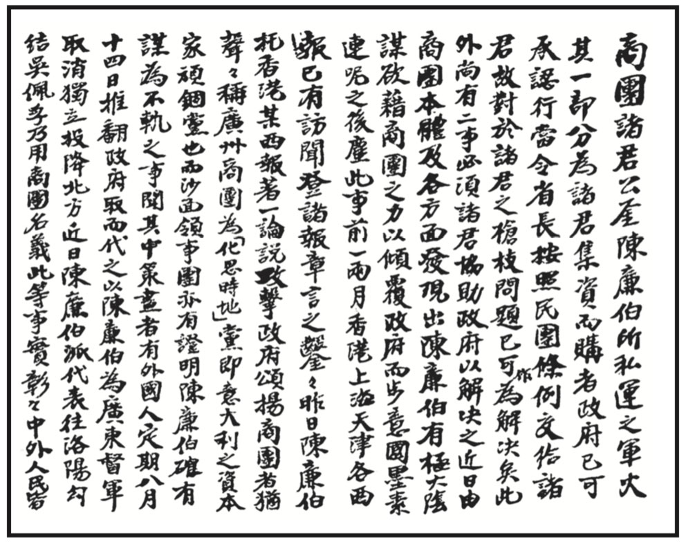Dr. Sun’s letter to the Guangzhou Merchant Group Society to persuade them from supporting Chen Lian-bo’s anti-government activities and the strike initi- ated by him, Aug. 19, 1924.