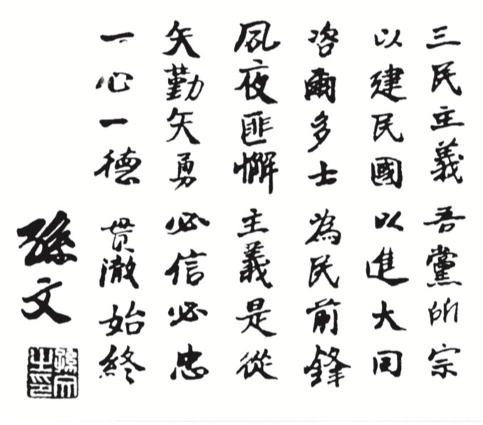 The Huangpu Military Academy’s precept in Dr. Sun’s handwriting: “The Three Principles of the Peo- ple are the principles of our Party, and the guidelines for building the Republic and achieving the Great Harmony.”