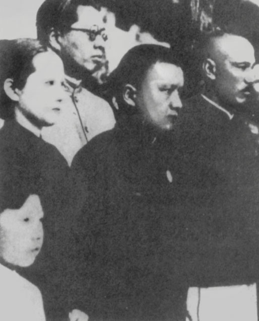 Mme. Soong Ching-ling (second, right) and Chiang Kai-shek (first, right) await- ing Dr. Sun’s coffin at the Pukou Railway Station, May 28, 1929.