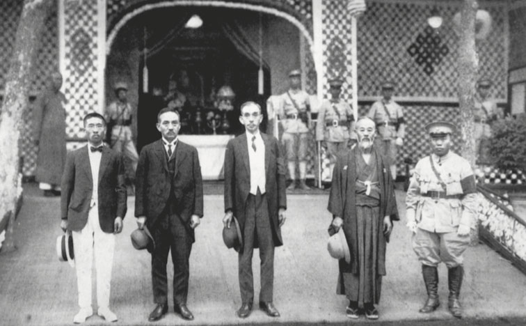 Dr. Sun’s Japanese friends Umeya Shokichi (second from right) and Yamada Junzaburo (third from right) paying tribute to Dr. Sun at Biyun Temple, May 25, 1929.