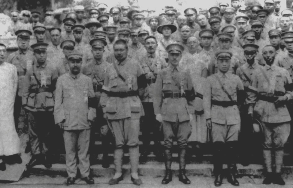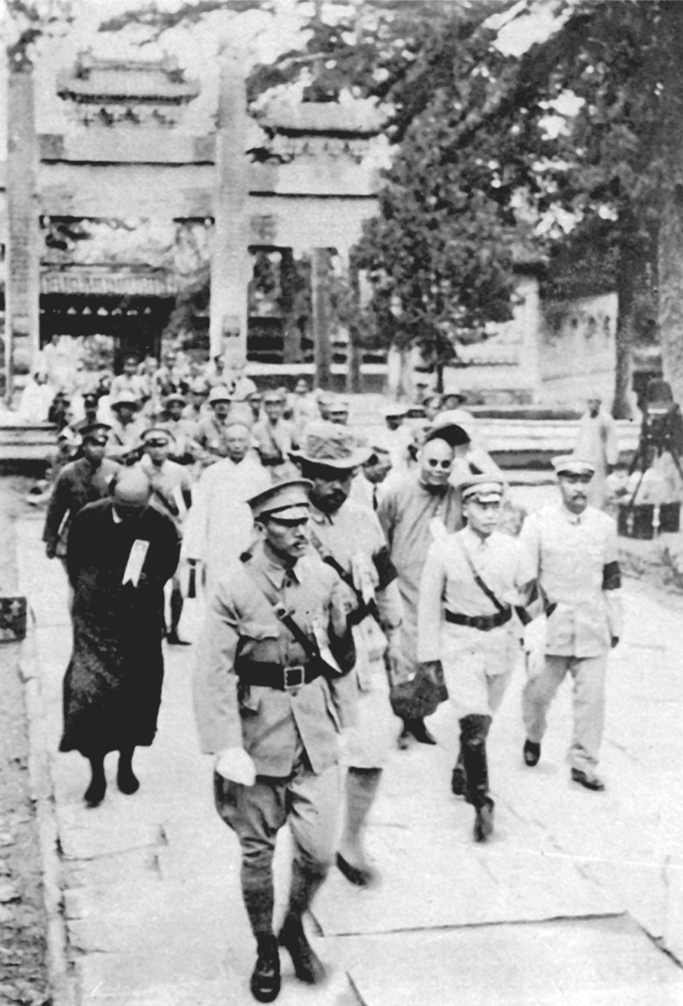 Commanders-in-Chiefs of the army groups, led by Generalissimo Chiang Kai-shek, visiting Biyun Temple to worship Dr. Sun and inform him of the success of the Northern Expedition, Jul. 6, 1928.