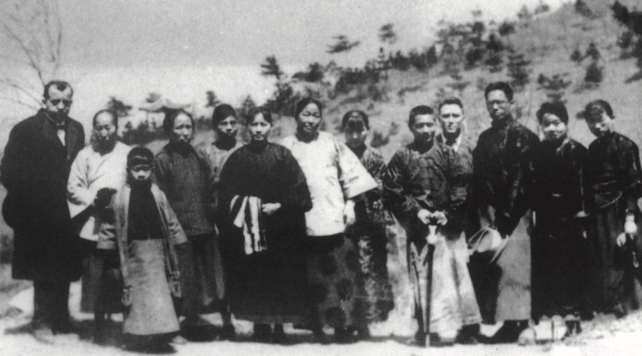 On April 20, 1925, Mme. Soong Ching-ling arrived in Nanjing from Shanghai to inspect the site of Dr. Sun’s tomb on the Zijin Hill: (from left) Ma Kun, He Xiang-ning (fourth), Mme. Soong Ching-ling (sixth), Ni Gui- zhen, Soong Mei-ling, T. A. Soong, a